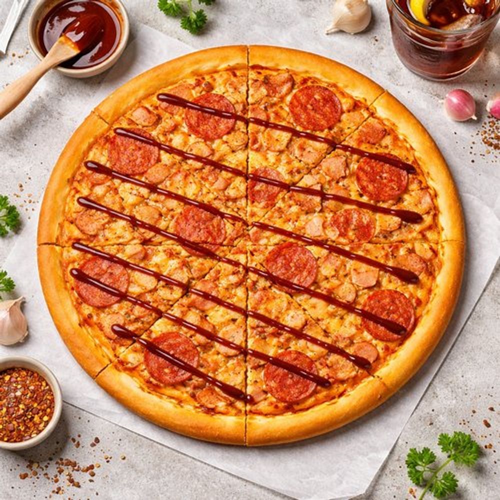 Состав начинки: пепперони, ветчина, куриное филе, бекон, сыр Моцарелла, соус Маринара