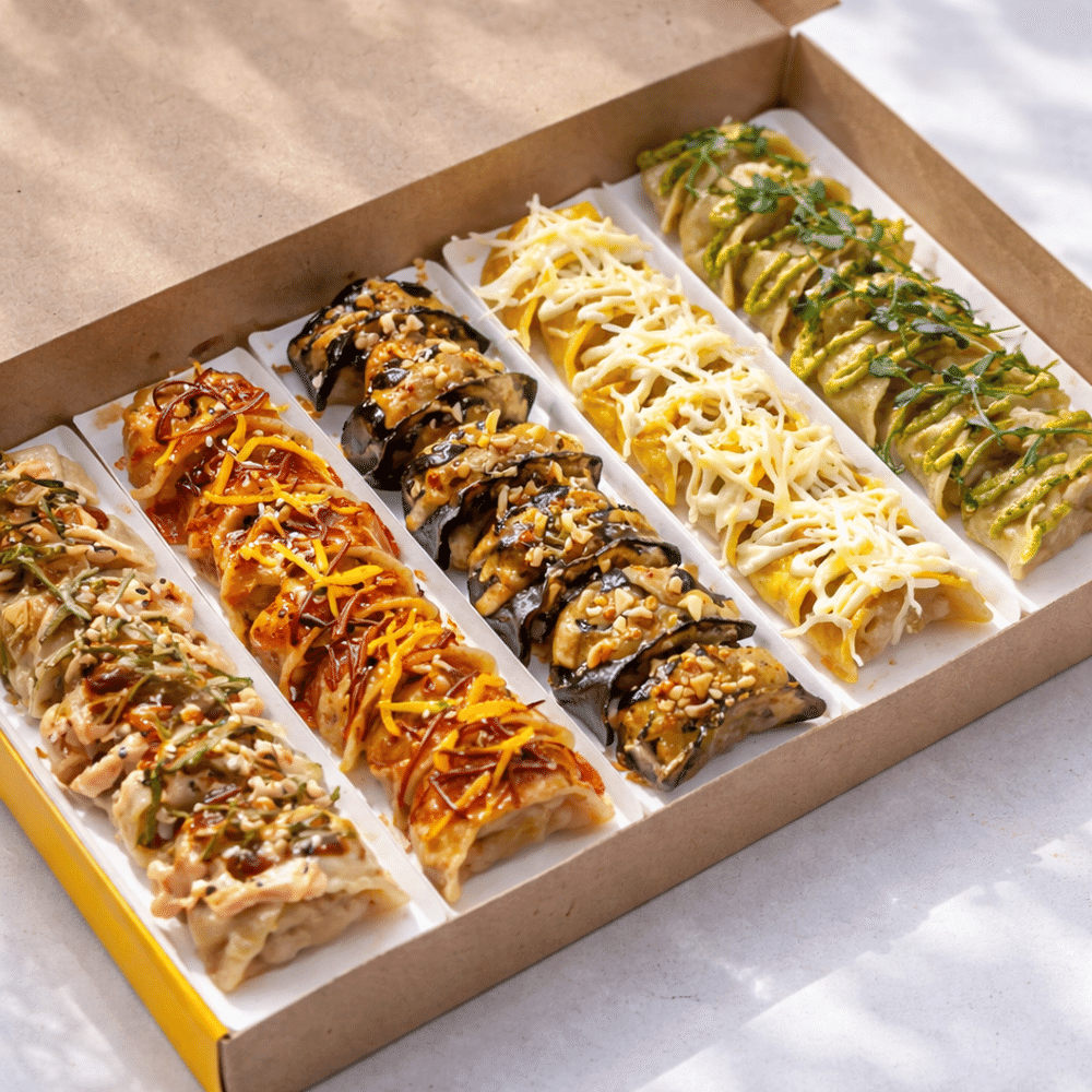 Гёдза под 5-ю видами соусов: японским унаги, корейским кисло-сладким, китайским арахисовым, сырным сливочным, средиземноморским.