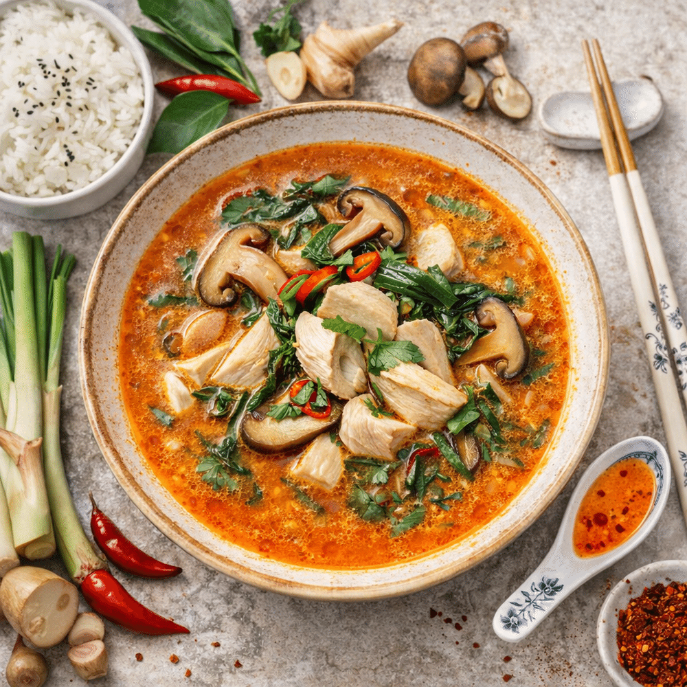 Знаменитый тайский суп Том Ям в вариации с курицей. Подается с чашей риса.
