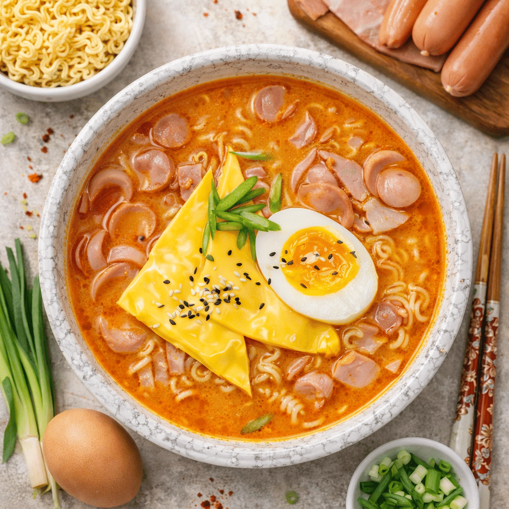 Рамен с копченостями, сыром и рамёной лапшой.