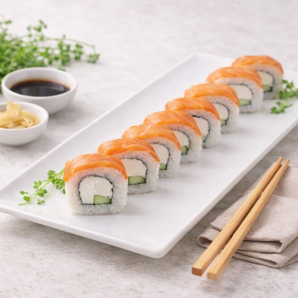 Состав: семга, огурец, рис, нори, сыр творожный.