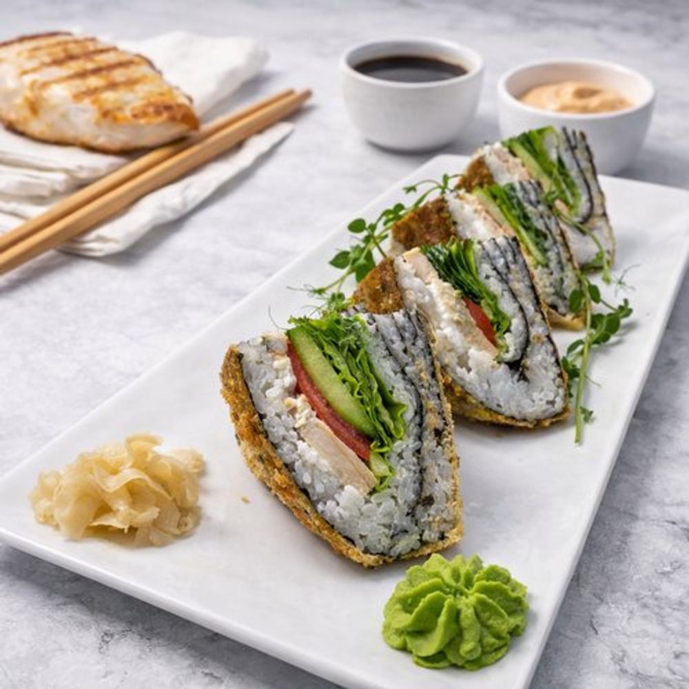 Состав: курица, лист салата, помидор, огурец, сыр творожный, рис, нори, панировка.