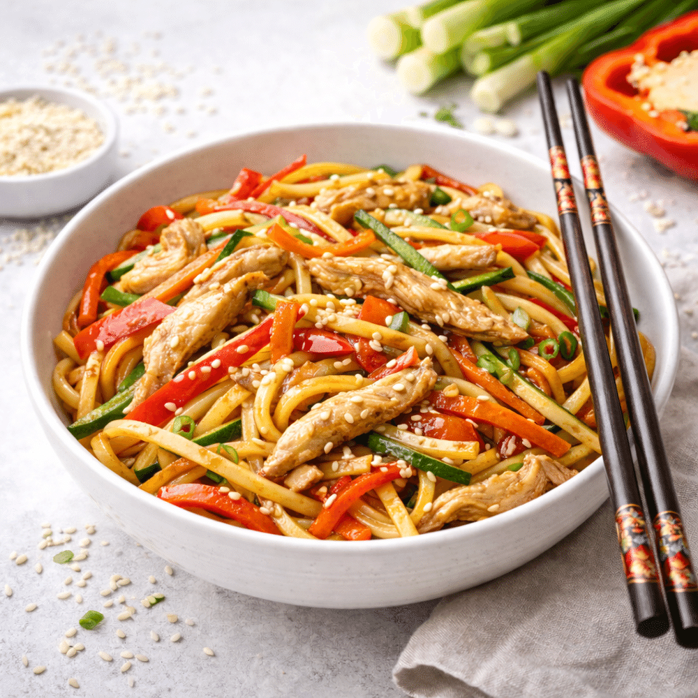 Лапша удон с курицей и овощами.