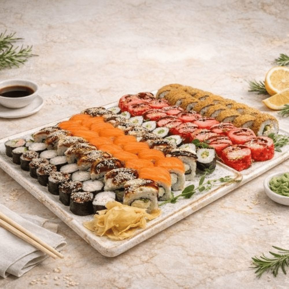 Сет из 96 кусочков: 16 филадельфия, 16 – унаги филадельфия, по 8 – саке темпура, кани темпура, нежный краб, нежный лосось, минироллы с угрем, семгой, крабом, огурцом